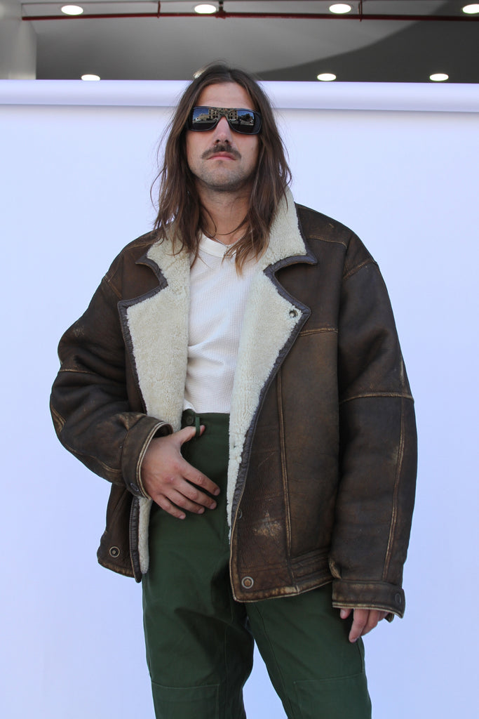 Beige 1980s Belted Leather Moto Bomber Jacket