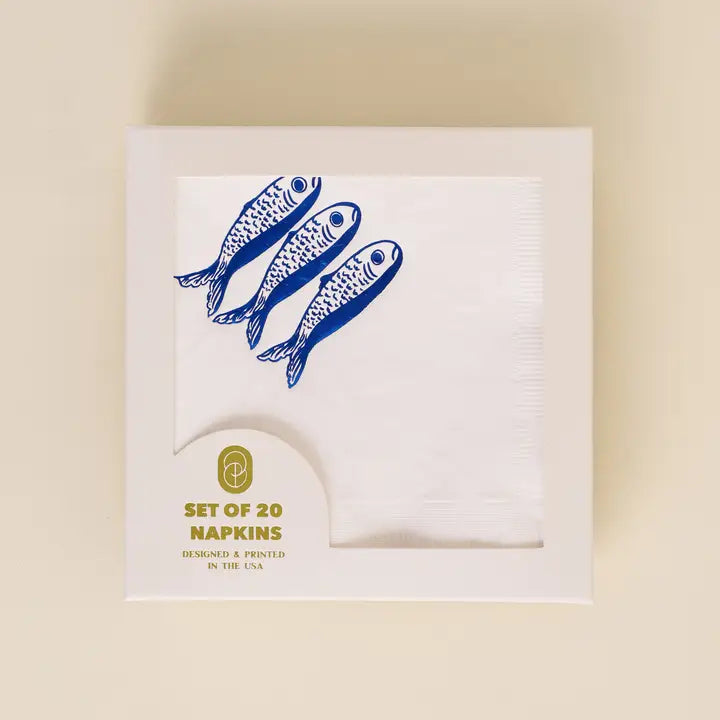 Add a splash of charm to your next gathering! These whimsical cocktail napkins, featuring hand-illustrated blue sardines, bring a touch of style to every sip and snack.
