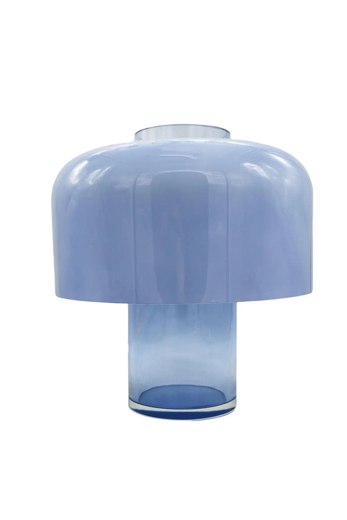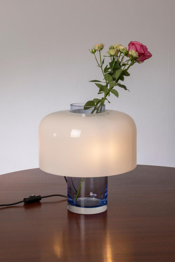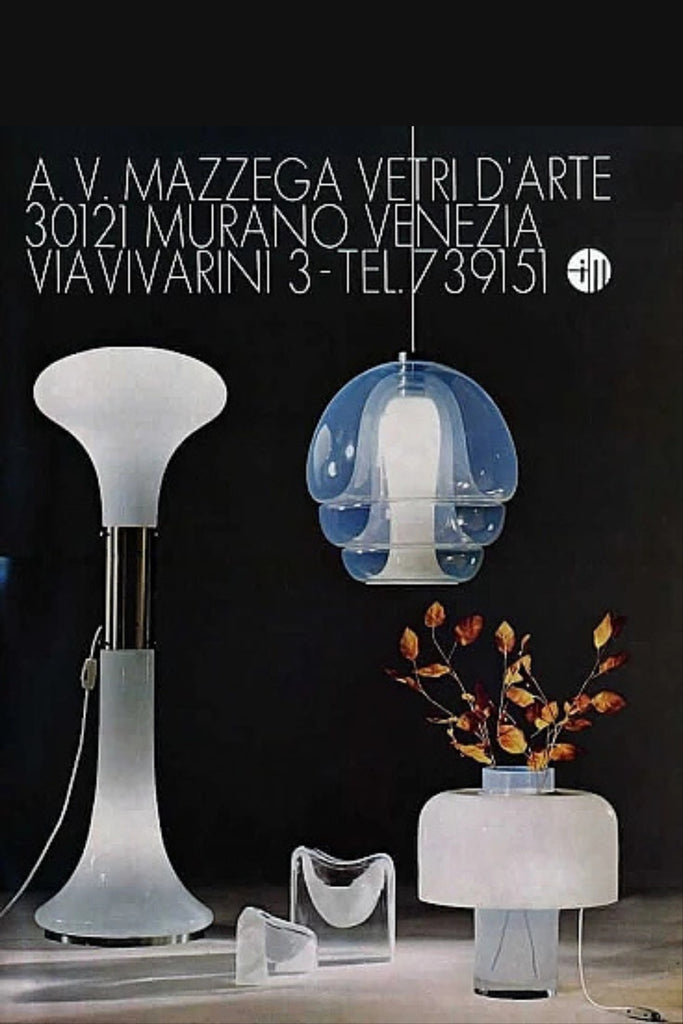 The lamp showcases Mazzega’s signature blown Murano glass, with a gently curved shade that casts a soft, ambient glow when illuminated. Its silhouette draws inspiration from Japanese metal vessels, combining clean lines with a subtly organic shape. The glass base, thick and tactile, adds to its sculptural appeal while anchoring the lamp with a sense of balance and refinement.