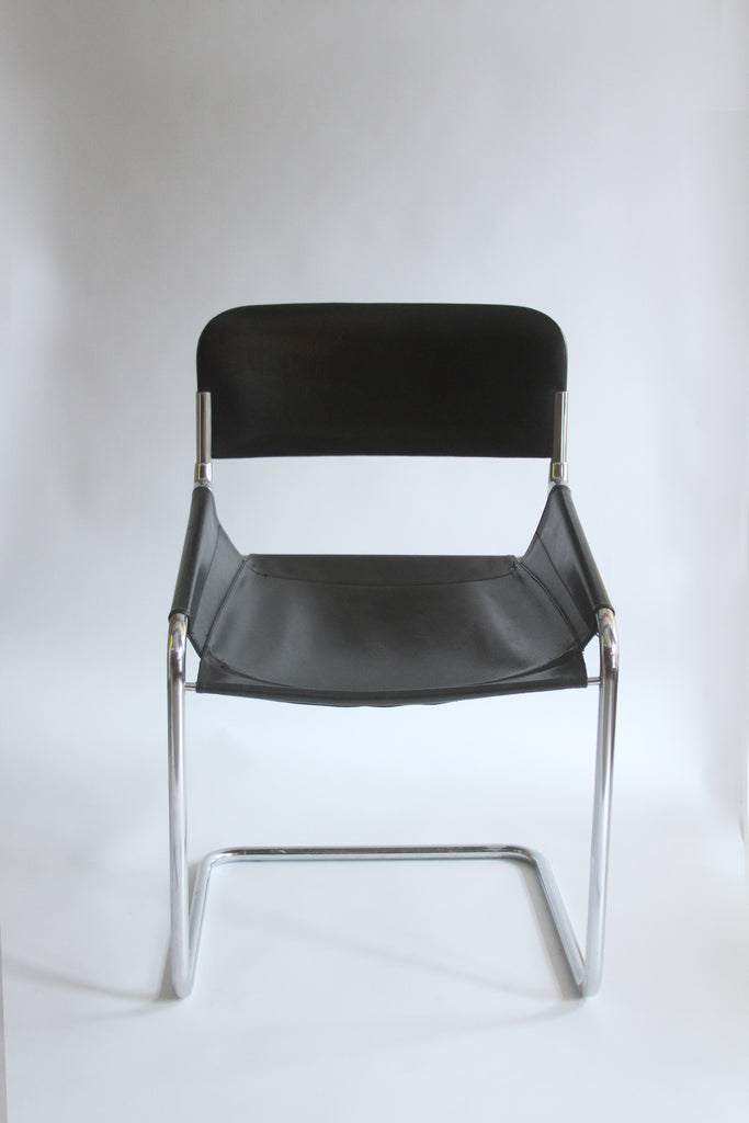 A stunning example of minimalist design, these Italian chairs from the 1970s showcase sleek tubular chrome frames that elegantly suspend high-quality black leather sling seats. The ergonomic construction allows the leather to contour to the sitter’s body, while the cantilevered design offers a slight, flexible give for added comfort. Sourced in Italy, 1970s.