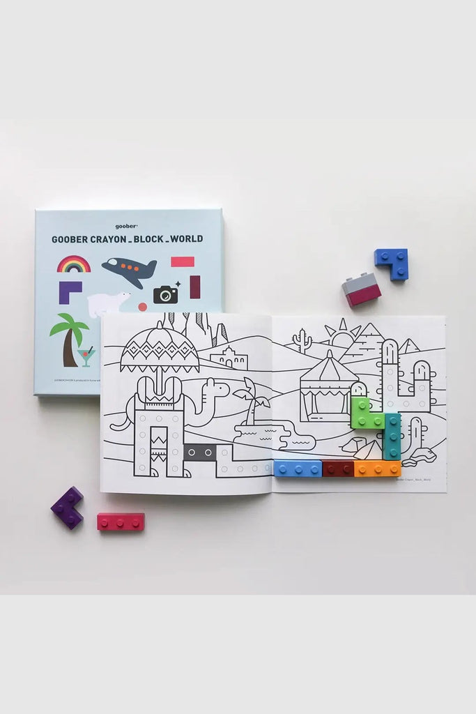 Coloring around the world with Goober's new Block Crayon. These 14 crayon blocks can interlock as puzzles and come with a super fun world coloring book. The pocket-size coloring book includes a world map and many fun places around the world to color in. Block shaped crayons are designed to help small muscle development and motor skills and can be used for additional play as well as coloring.