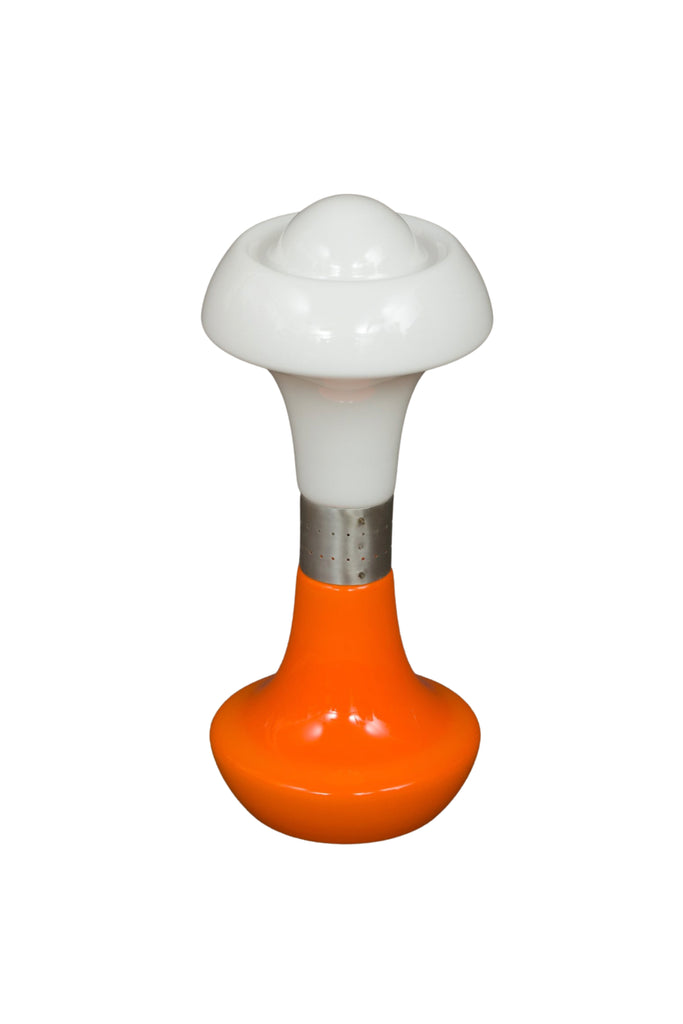The "Birillo" floor lamp was made in various models by Nason in the 1960s , all with mushroomed tops and cone bottoms. This lamp has classic two-toned Italian Murano Glass bulbs with chrome-plated metal joint. There are two light points a white, an atmospheric orange, and the option to have them both at once. In excellent condition with minor wear on chrome. Has been re-wired with original step-on cord.