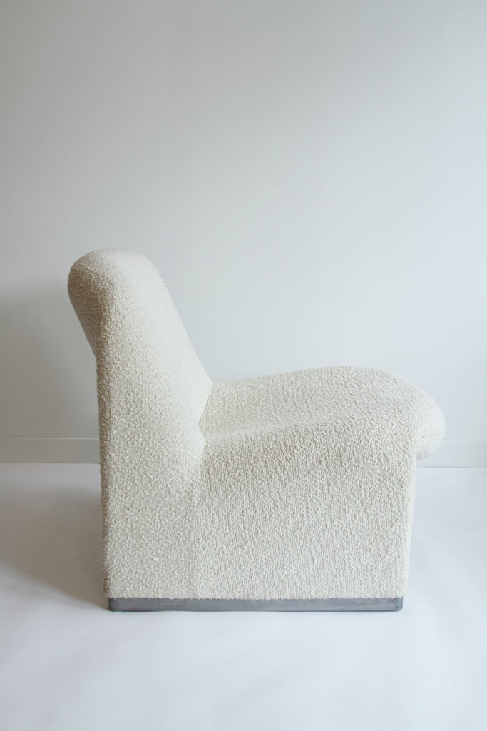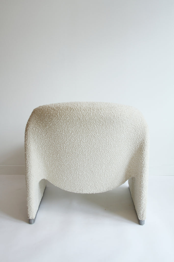 "Alky" slipper lounge chair designed by Giancarlo Piretti in 1969 and produced by Castelli. This chair is in the original upholstery in a soft Ivory Boucle. Foam with metal base. The distinctive curved shape has a timeless appeal. Signed.