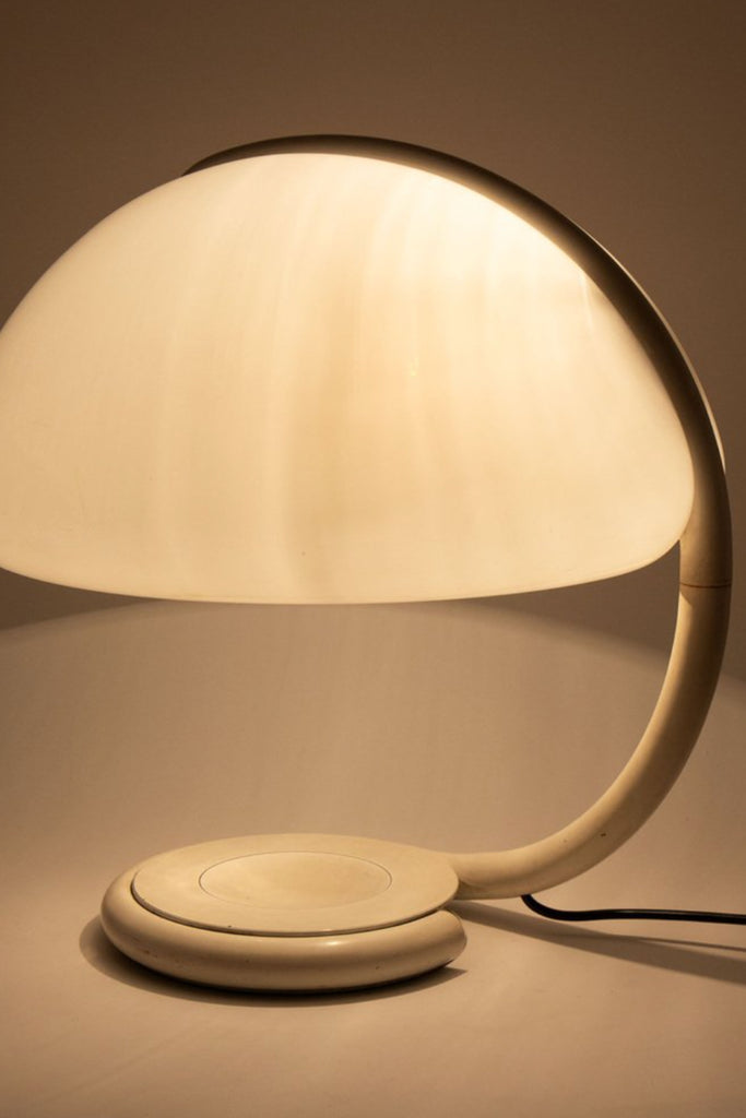 Designed in 1965 by Elio Martinelli, the Serpente Table Lamp is a quintessential piece of mid-century Italian design. Its sinuous, snake-like form features a swiveling upper arm that gracefully supports a domed, white opal methacrylate diffuser, providing soft, ambient illumination. Crafted with innovative materials and techniques of the era, this lamp embodies the Space Age aesthetic and is celebrated for its blend of form and function. An iconic design, the Serpente Lamp is part of the permanent collection at The Metropolitan Museum of Art in New York.