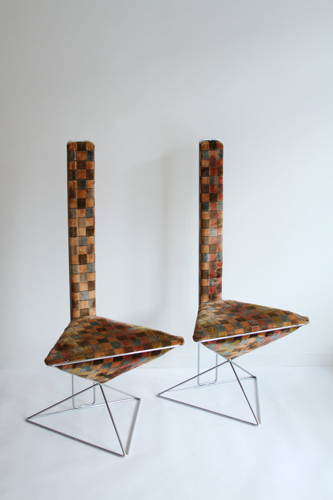 These accent chairs feature a pyramid back rest and seat and minimal chrome frame. Original Velvet Upholstery in rose, gray, yellow, and brown patchwork. Unknown Designer, from Italy. In Great Condition. Price per chair.