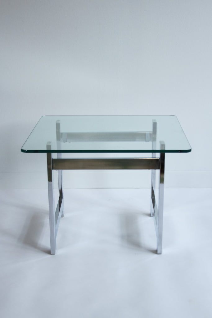 Classic square glass top coffee table with chrome frame and legs. Unknown Designer. In Excellent Condition.