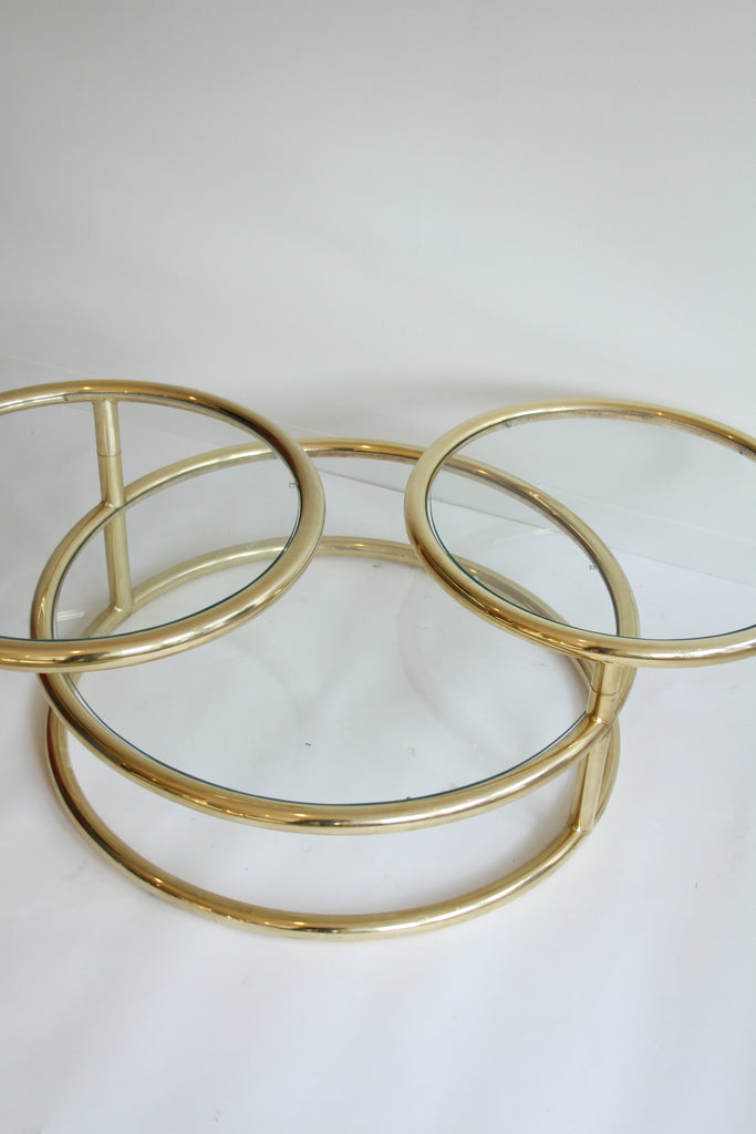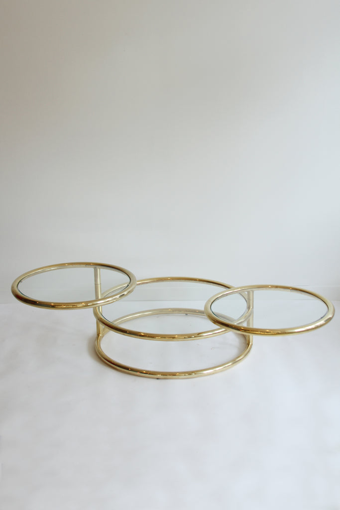 A vintage circular coffee or cocktail table with three pivoting tiers. The piece is in good vintage condition with age appropriate wear; some scratches to glass and brass.